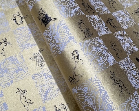 This Yuzen paper features humorous animals inspired by the scrolls, arranged in an ichimatsu (checkered) pattern.