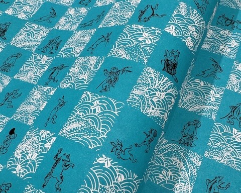 This Yuzen paper features humorous animals inspired by the scrolls, arranged in an ichimatsu (checkered) pattern.