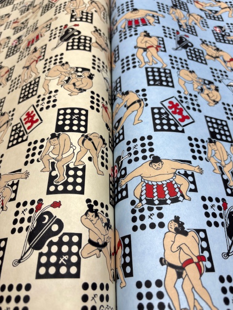 The background is inspired by a traditional sumo tournament score chart (hoshitori-hyo).